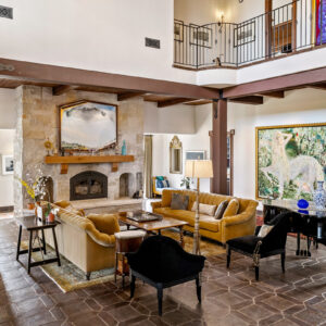 The main residence, crafted in 2017 and complete with an elevator, “offers an exceptional living experience,” says Meredith. Richly detailed inside and out, the expansive retreat has echos of the early California hacienda style with exposed beams, imported Spanish tile and wrought iron throughout. Large windows frame far-reaching views of meadows and hills while welcoming an abundance of natural light.