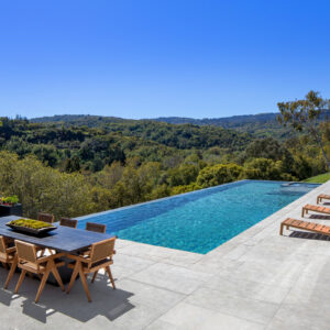 The latter reveals itself at key moments in the architecture, perhaps most dramatically in the grand double-height living and dining room space where a disappearing glass curtain wall opens to a broad terrace. The adjacent great room, with its open kitchen and family room, provides yet another connection with the natural surroundings as another set of pocketing glass doors slide open to reveal an infinity pool with wooded hillsides in the distance.