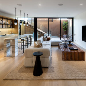 Swatt | Miers’ expertise in melding the indoor-outdoor experience with the modernist aesthetic shines through in the home’s horizontal volumes, contrasting juxtaposition of wood, stucco, and stone, and the dynamic interplay between the interiors and the landscape.