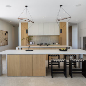 In the kitchen, Neolith counters, custom French cabinetry by Chabert Duval, and top-quality appliances from Gaggenau and Pitt integrated burners, ground the entire space while double islands cast the perfect balance of form and function. Meticulous attention to detail carries throughout the home’s entire three levels – from the four upstairs bedroom suites including the resort-worthy primary suite with wraparound deck to the lower level rec room, bar, theater, and guest suite.