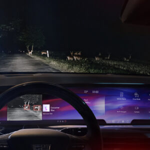 Front-facing view of the pillar-to-pillar screen in the Cadillac ESCALADE IQ Sport at night with night vision activated. Photo Credit: Cadillac